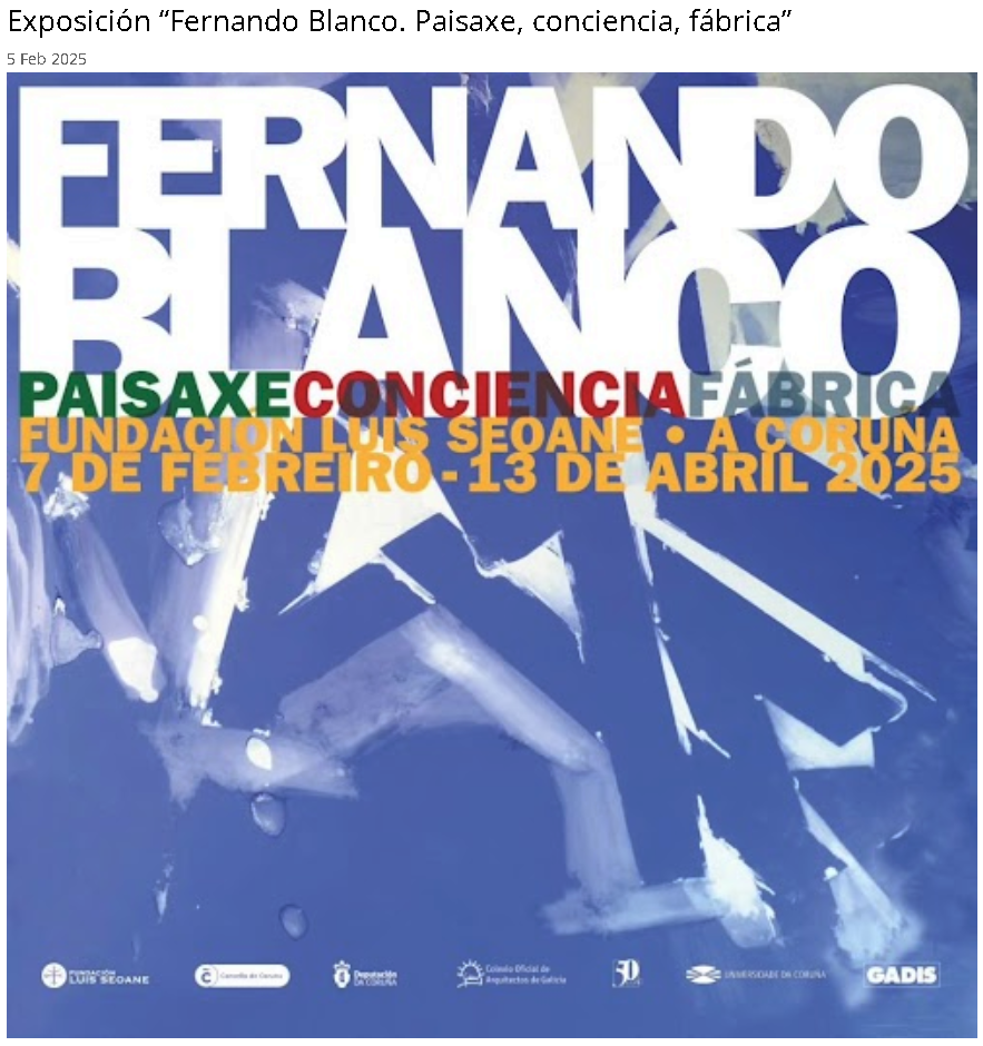 El Colegio de Arquitectos te invita a participar de la inauguración de la exposición del maestro arquitecto Fernando Blanco Guerra: FERNANDO BLANCO. PAISAJE, CONCIENCIA, FÁBRICA, organizado por la Fundación Luis Seoane de A Coruña, el próximo viernes 7 de febrero a las 19:30 horas. Un recorrido por casi la totalidad de su obra arquitectónica y creativa que muestra su capacidad multidisciplinar y su aportación a la cultura gallega durante los últimos 50 años.